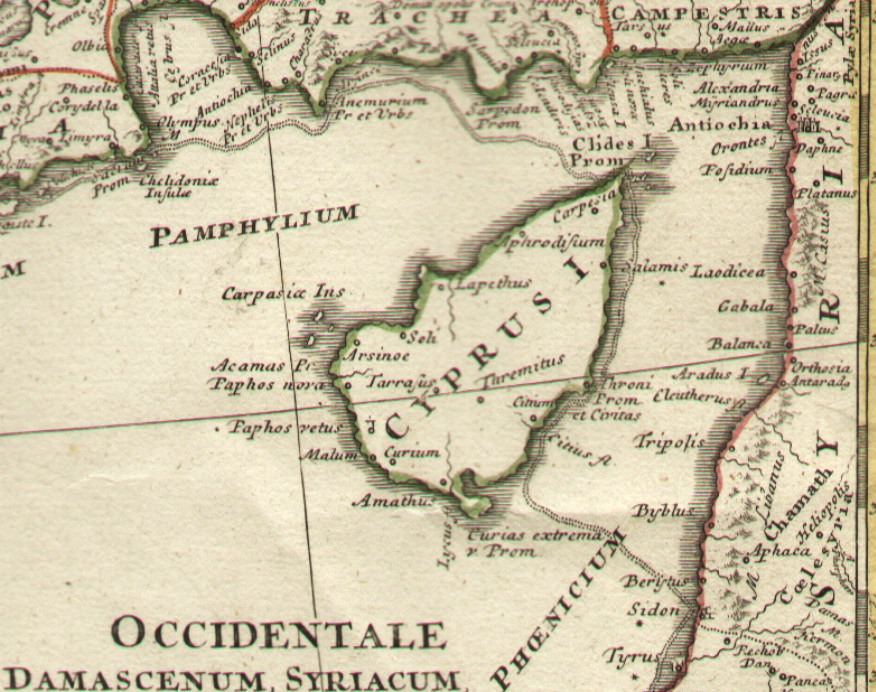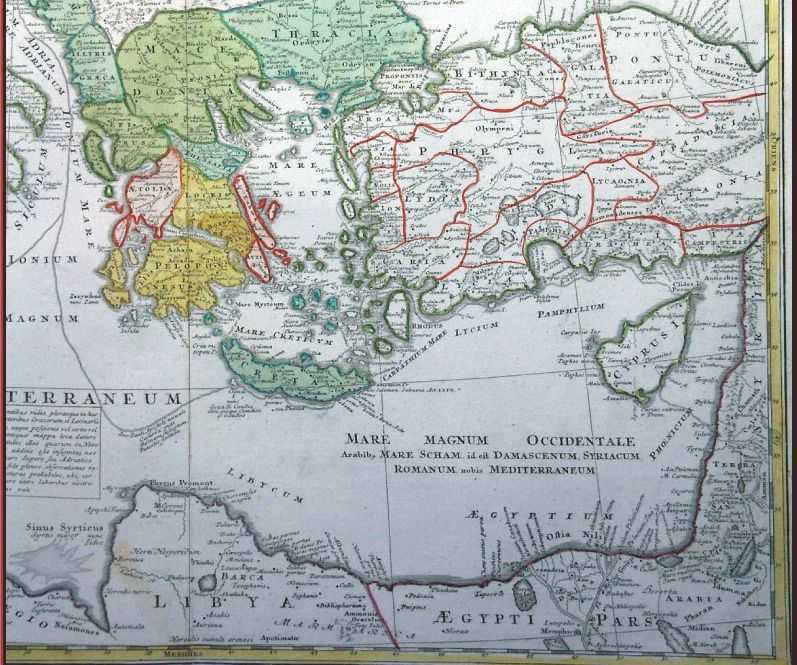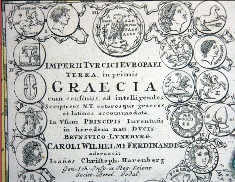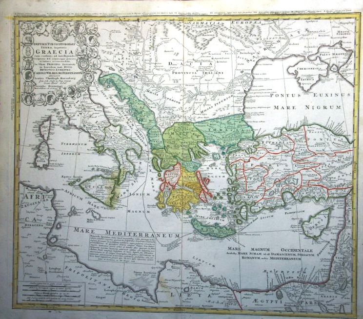"IMPERII TURCICI EUROPAEI TERRA, in primis GRAECIA.." by J.B. Homann/ I.C. Harenberg. Nurnberg 1741. 59 x50 cms. Beautiful copperplate map of the Eastern Mediterranean basin with an interesting cartouche depicting coins of ancient Greece. Printed on thick paper, nice old colour with ample margins. Price: CyP 300.00