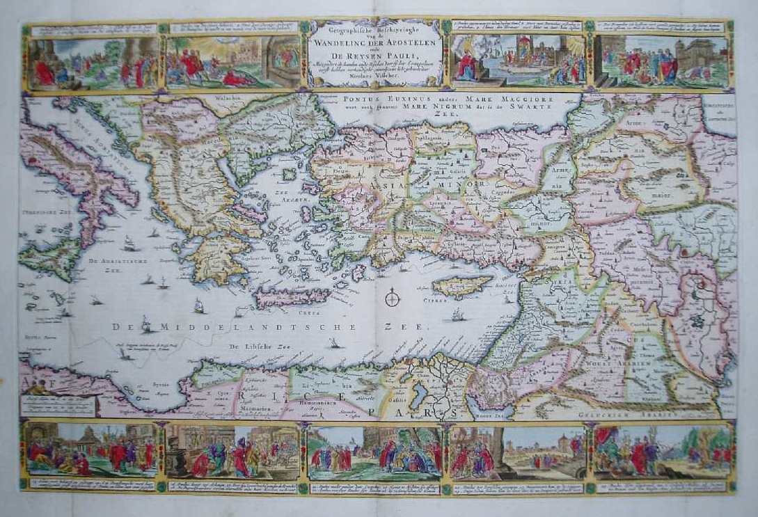 depicting the route of Apostle Paul. Panels of Biblical scenes at top