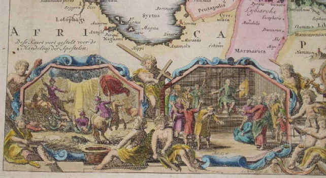 Biblical scenes at bottom showing the major events of his travels. Map