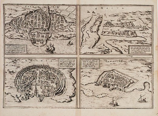 | Calaris/Malta/Rhodus/Famagusta. Braun & Hogenberg. Cologne / 1582 (circa). Size: 48 x x 33 cms. Uncoloured as published. Minor browning along fold. Detailed plans of four Mediterranean island capitals: Cagliari (Sardinia), Valletta (Malta), Rhodes, and Famagusta (Cyprus) on one sheet from Braun & Hogenberg's book of town plans, Civitates Orbis Terrarum. Price: CyP. 550.00 |