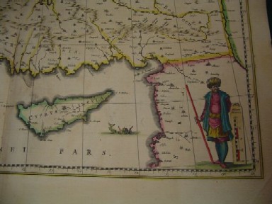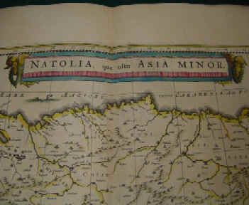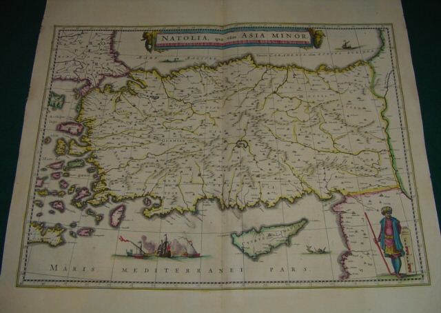 | NATOLIA quae olim ASIA MINOR by Johannes Blaeu. Amsterdam c1648. Latin text edition. 39x50 cms. Fine old colour ( possibly 1760-80 ), superb condition overall and extremely well coloured. Wide margins all round. A fine map of the whole of Turkey with a spectacular sea battle in the Mediterranean; also showing Cyprus with a sea monster to its east. Price: CyP 300.00 | |