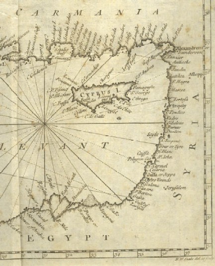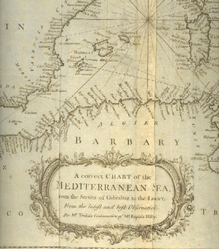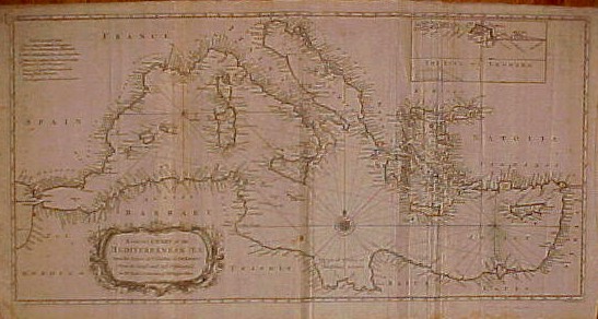 | "A correct Chart of the Mediterranean Sea, from the Straits of Gibraltar to the Levant; From the latest and best Observations: Fro Mr. Tindal's Continuation of Mr. Rapin's History." The inset map in the upper right is titled "The Road of Leghorn." It is inscribed "R.W. Seale del et sculp." The map is copperplate engraving printed in circa 1728. The sheet measures 64 x 38 cms. There are several folds that can be ironed out when framed; there is also some foxing spots but not very heavy. Price: CyP 220.00 A better copy of this map is also available. Price: CyP 280.00 , FRAMED. | |