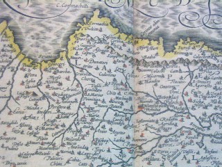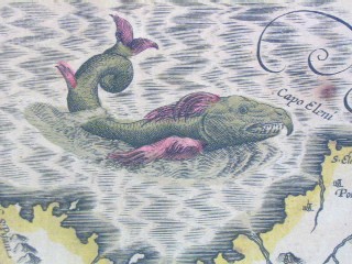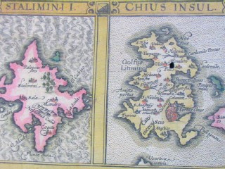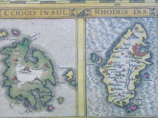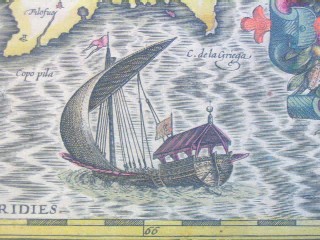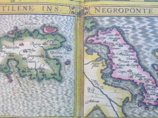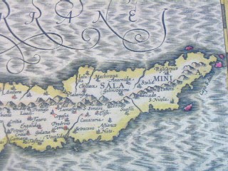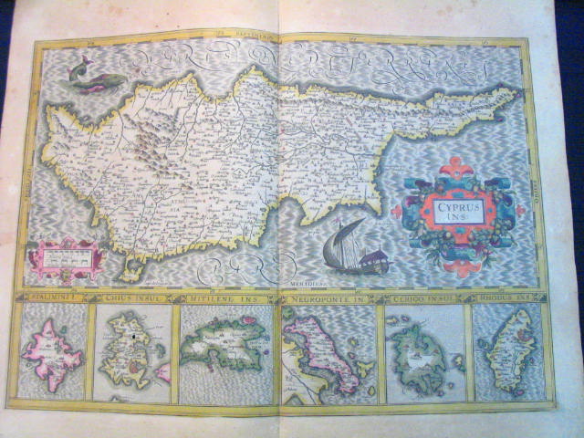 | "Cyprus Ins." Amsterdam, ca. 1636. SIZE: Sheet size: 21 x 18 inches, plate size:490 x 350 mm. PAPER TYPE: laid paper with chainlines, no watermark visible when held up to light. CONDITION: Very good map with general tanning to margins, bit of spotting to upper margin, one or two faint tan spots visible in plate, notably at the cartouche and northwest coast near fish's nose. Also small match-head-sized hole in the middle of one of the island insets (Chius), which has been expertly repaired, minor separation at bottom center fold, other than that a lovely map with wide margins, great original hand-coloring, has text in French on rear and has original center guard. NOTES: This map shows Cyprus, plus insets of six islands: Stalimini, Chius, Mitelene, Negroponte (ref. to the bridge between the Greek mainland and the island Europa), Cerigo (sometimes called Kithira), and Rhodus (Rhodes). Keywords: Greece, Aegean, Turkey This map is from one of the great Hondius/Mercator atlases of the early 17th century. Jodocus Hondius (1563-1612) bought Mercator's map plates and added many of his own and also improved on Mercator's and Ortelius's maps. After his death, he was succeeded in the business by his sons and they issued many editions of their justly celebrated atlases between 1605 and 1641 with texts in several languages. This is from a French edition. Price: CyP: 1000.00 | |