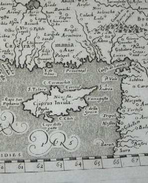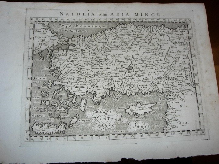 "Natolia olim Asia Minor" Engraved map, 13.5 x 17.5 cm. Text on verso, from the rare 1596 Venice edition of: "Geographiae universae tum veteris tum novae absolutissimum opus duobus voluminibus distinctum, In quorum priore habentur Cl. Ptolomaei Pelusiensis Geographicae enarrationis Libri octo: Quorum primus, qui praecepta ipsius facultatis omnia complectitur,, commentariis uberrimis illustratus est a Io. Antonio Magino Patavino". By Claudius Ptolemaeus (Ptolemy), a new Latin edition (publisher: Giovanni Antonio Magini). Maps are engraved by Girolamo Porro. Price: CyP 240.00 |