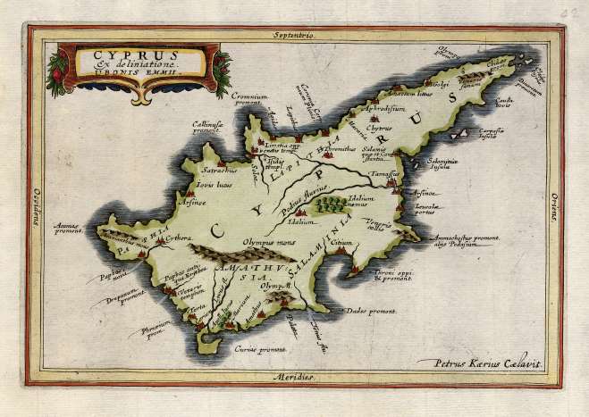 Cyprus Ex deliniatione Ubonis Emmii. by Ubonis Emmii, Published in Amsterdam, 1661 in Introductionis in Universam Geographicam. Size: 20 x 13 cms. Old hand colour. A very scarce small map of Cyprus drawn by Ubonis Emmii and based on the Parergon map of Ortelius. Its shape is rather deformed and it has fewer ancient place names than the map of Ortelius. Emmius was a cartographer who worked with Hondius and Jansson. This map, engraved by Petrus Kaerius, appears only in this edition of this popular geography published by Jansson. Price: CyP: 700.00 |