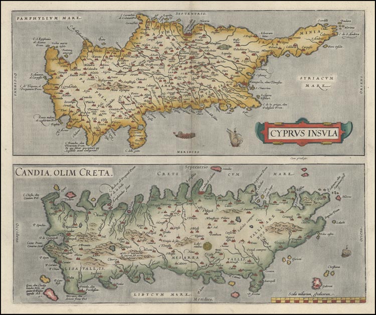 36.5 cms. Striking map of Ortelius' first map of Cyprus and Crete, from