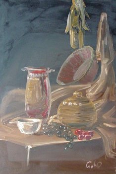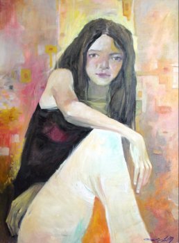 | STILL LIFE WITH GRAPES II. Post Impressionist. 41x61 cms. Oil on Canvas by Olga Ciob. Price CypP. 95.00 | MODEL. Expressionist. 51x71 cms. Oil on Canvas by Ciprian Cerbu. Price: CypP. 95.00 |