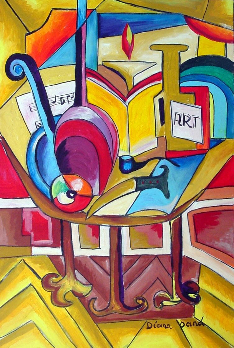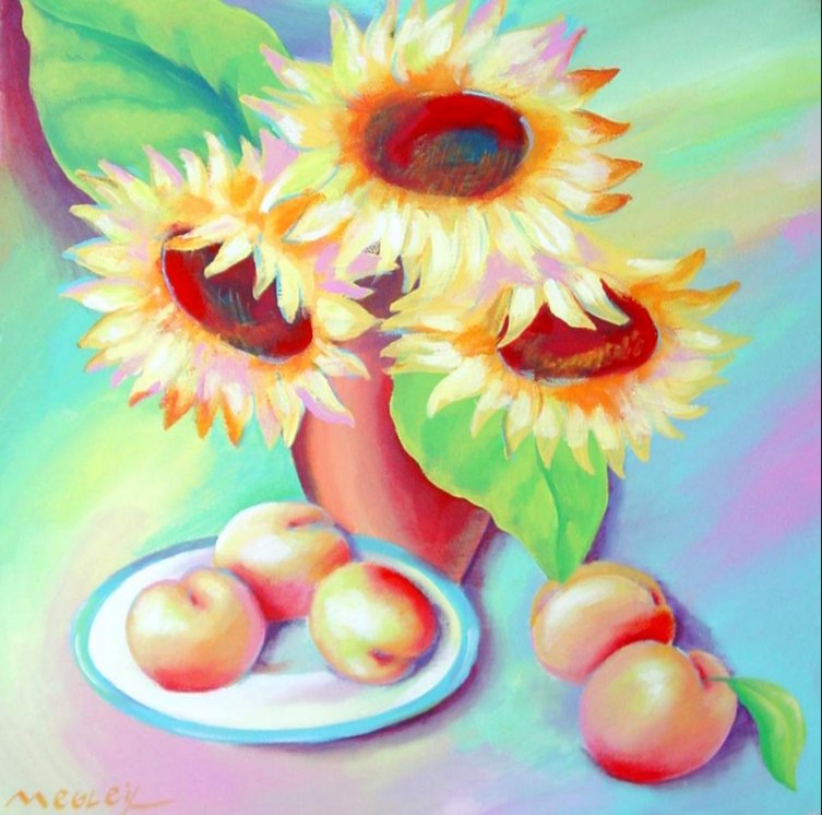 | SUNFLOWERS AND PEACHES by Meglei Angela. Acrylic on canvas. 51 x 51 cms. Post modernist. Price: Cy P 85.00 | TOGETHER by Oana Diana. Acrylic on canvas. 61 x 91 cms. Cubist. Price: Cy P 95.00 |