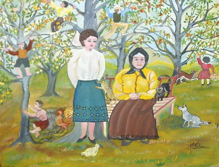 | IN THE ORCHARD by Andronic Salomia. Oil on canvas. 60 x 46 cms. Naive art. Price: Cy P 110.00 |