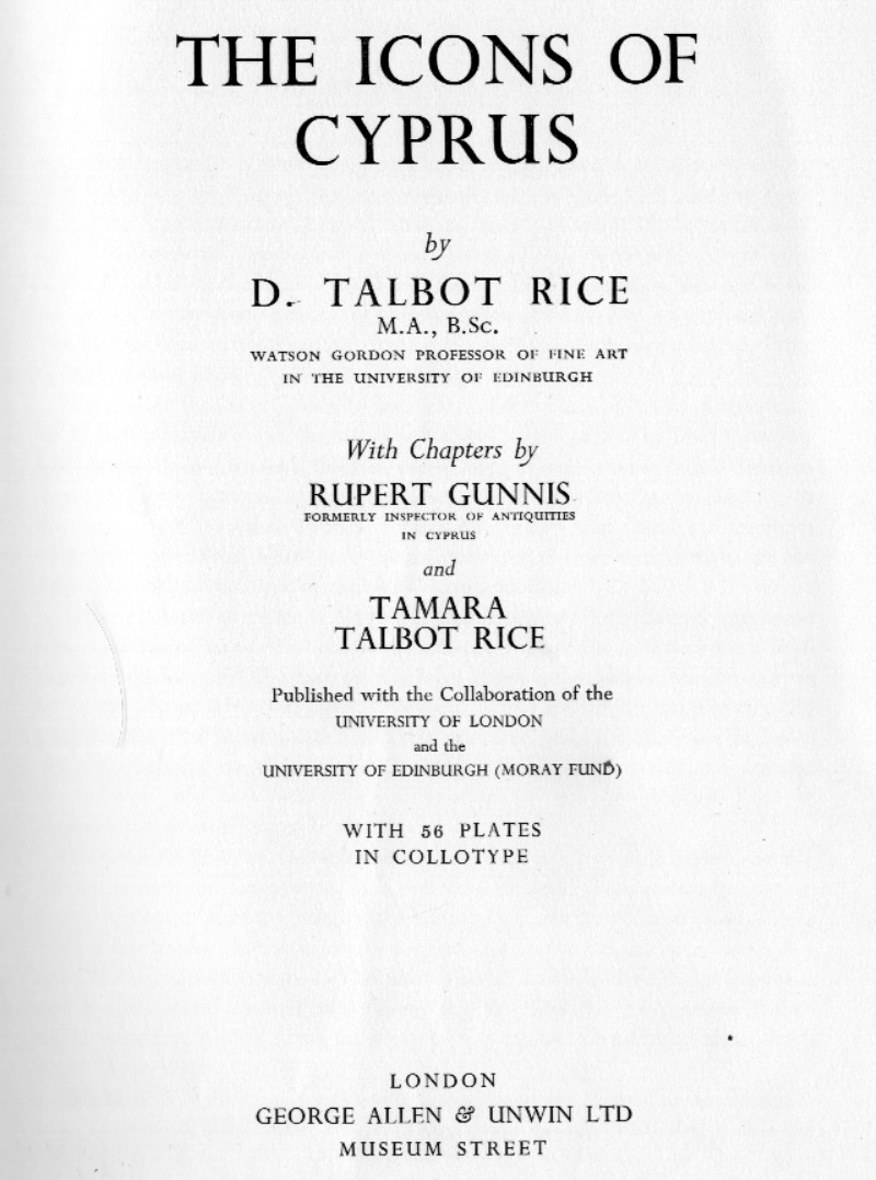 4to, 287 pages of text; Coloured frontispiece, 153 icons on 58 sheets (one in colour), 41 other illustrations of tapestries, costumes and coats of arms. Green cloth hardcover. A tight clean copy of this very important and rare,1937 study on Byzantine Cypriote iconography. Contributions by Rubert Gunnis and Tamara Talbot Rice.